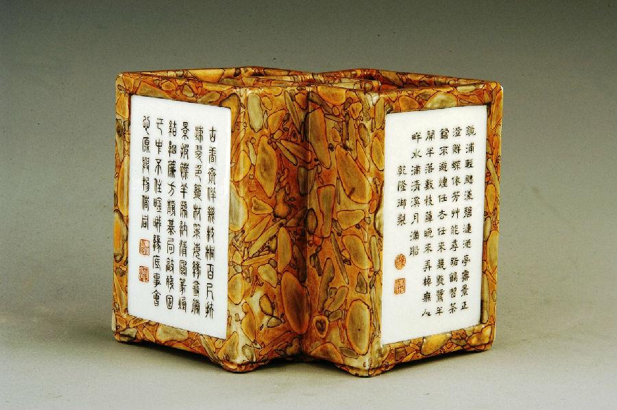 仿石釉是在烧好的涩胎上以釉彩勾绘或涂抹出石质纹理,再经低温二次烧成。兴起于清乾隆时期。造型有炉、盒、笔筒、盘等。民国时期亦有烧造,仿制效果惟妙惟肖,远观与天然原石并无二致。
