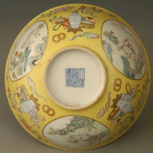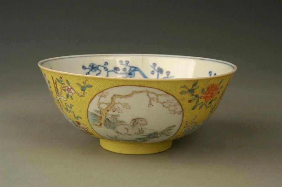 北京艺术博物馆藏黄地粉彩轧道开光三阳开泰纹碗,外壁为黄地粉彩轧道开光装饰。黄地部分绘三组粉彩纹样,包括瓶花、戟、连环、如意、石榴、锁麟囊等物件,表达“四季平安”“如意连环”“多子多福”等吉祥寓意。