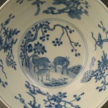 碗内里青花装饰,内壁绘折枝花果与杂宝组成的吉祥纹样四组——牵牛花与葫芦寓意“福禄绵长”,柿与如意象征“万寿如意”,磬与鱼相对、寓意“吉庆有余”。碗心双圈内绘三羊,寓意“三羊开泰。”碗外壁开光三个,内绘三羊,同样寓意“三羊开泰”。